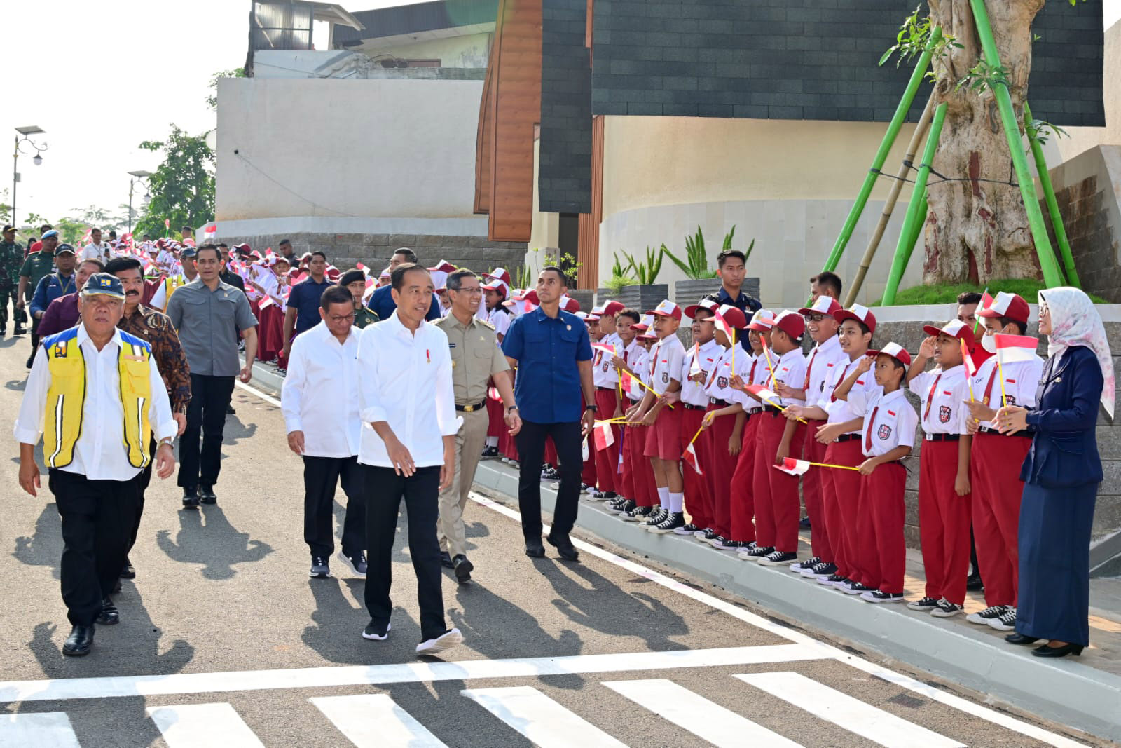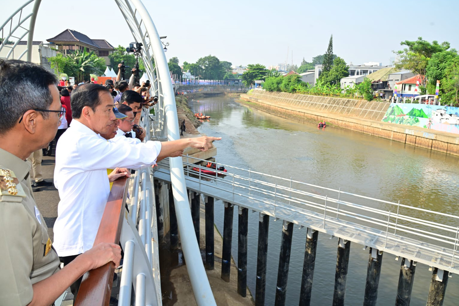 Presiden Joko Widodo (Jokowi) didampingi Pj Gubernur DKI Jakarta Heru Budi Hartono, Menteri ATR/BPN, Hadi Tjahjanto dan Menteri Pekerjaan Umum dan Perumahan Rakyat (PUPR) Basuki Hadimuljono meninjau Sodetan Ciliwung,di Bidara Cina, Jakarta, Senin (31/07/2023) (katafoto/HO/ BPMI Setpres/Muchlis Jr)