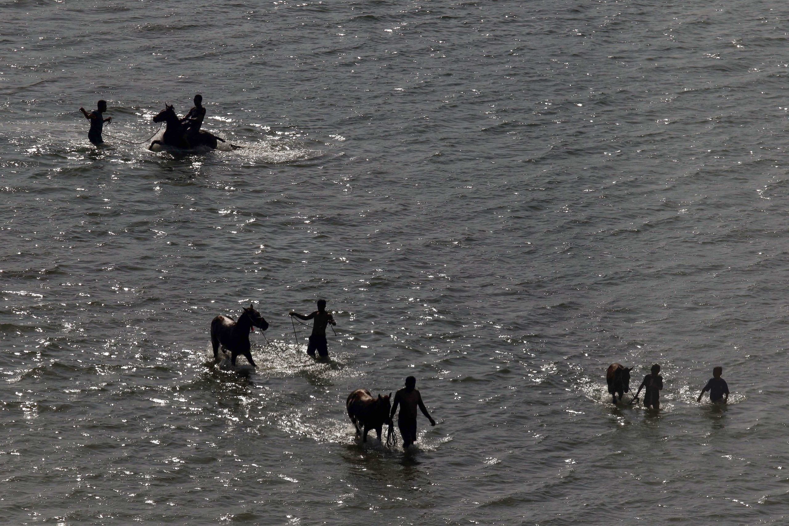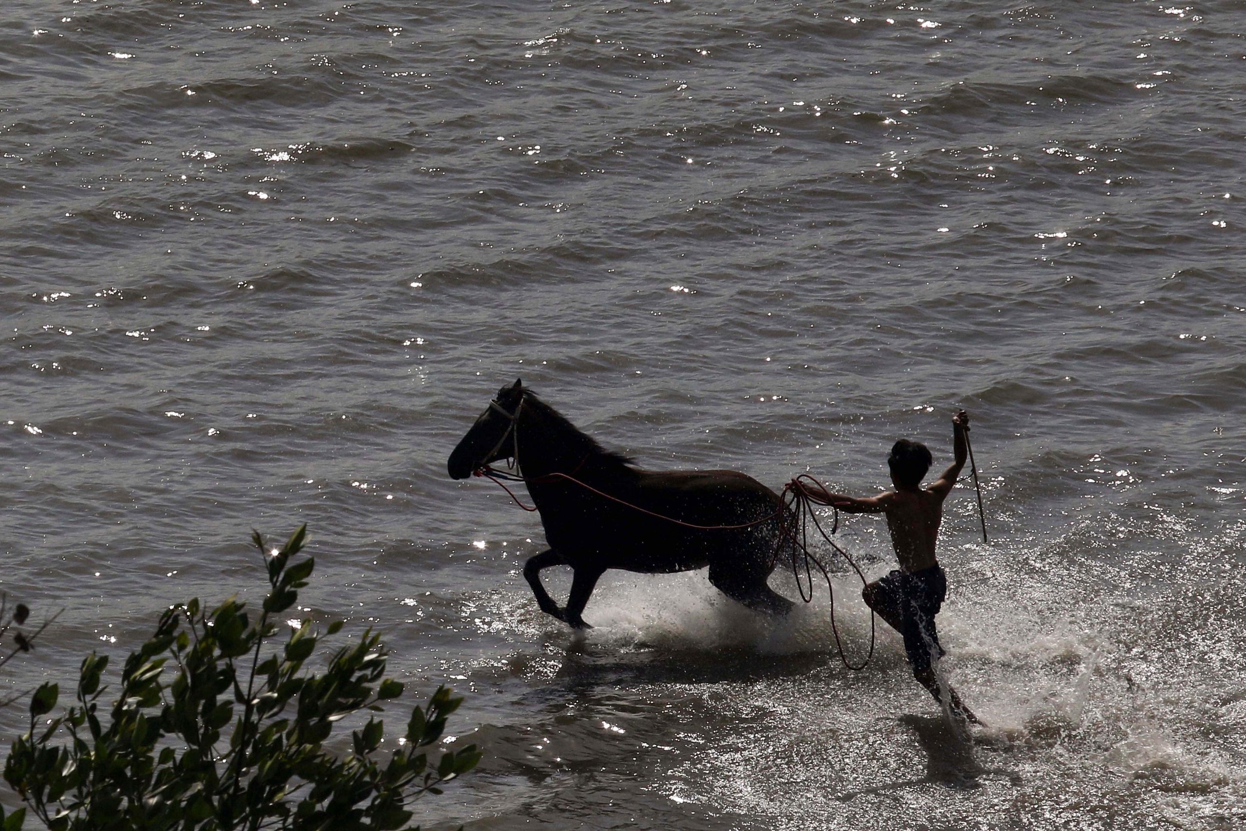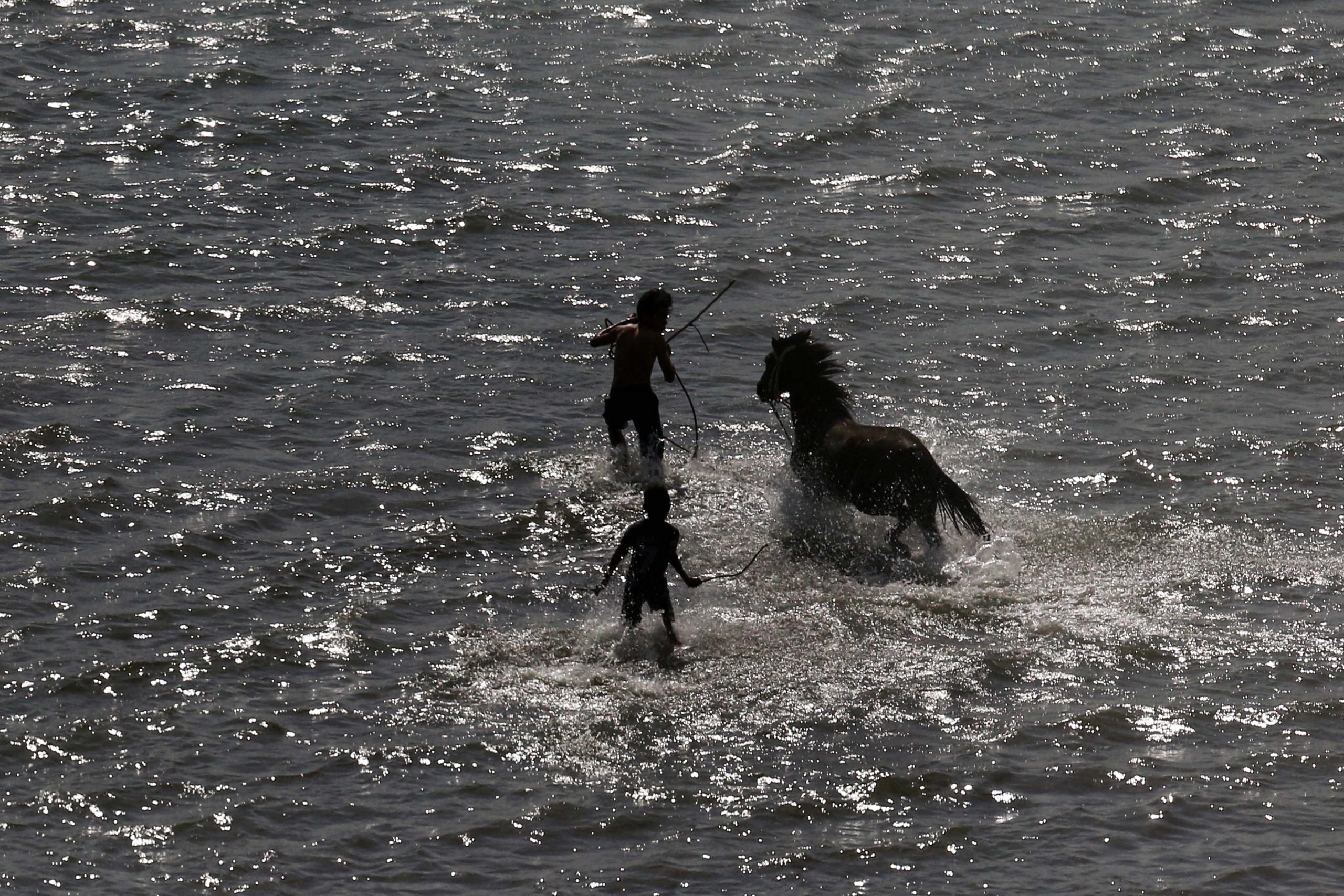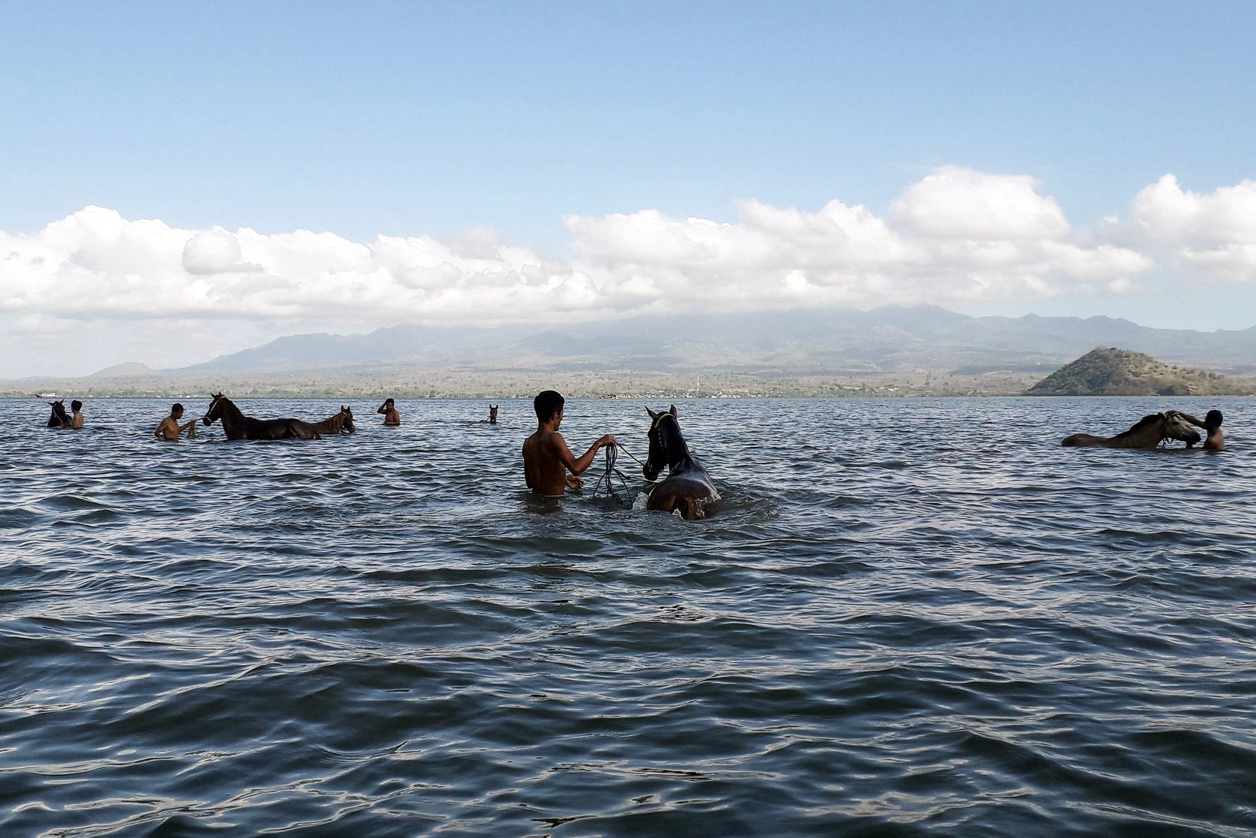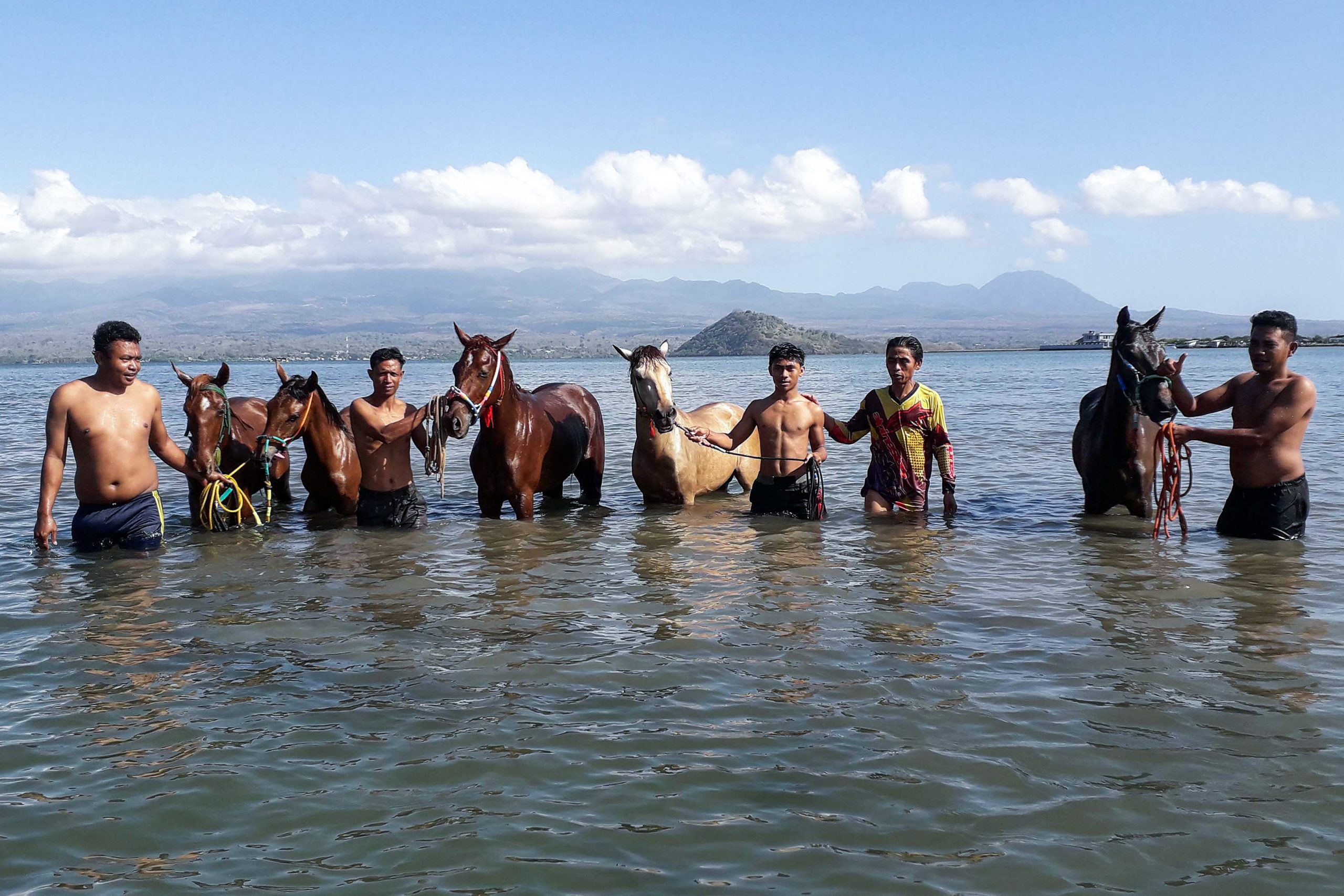 Warga yang mayoritas laki-laki memandikan dan melatih kuda pacu di kawasan pantai Amahami, Bima, Nusa Tenggara Barat, (27/7/2023). (katafoto/Adam Erlangga)