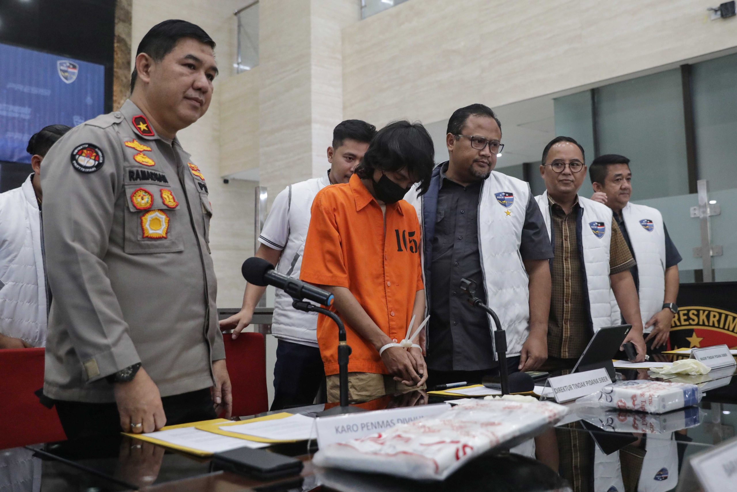 Tersangka dihadirkan dalam kasus tindak pidana akses ilegal dalam peretasan kartu kredit untuk pembayaran secara elektronik di Bareskrim, Mabes Polri, Jakarta, Selasa (8/8/2023). (katafoto/str)