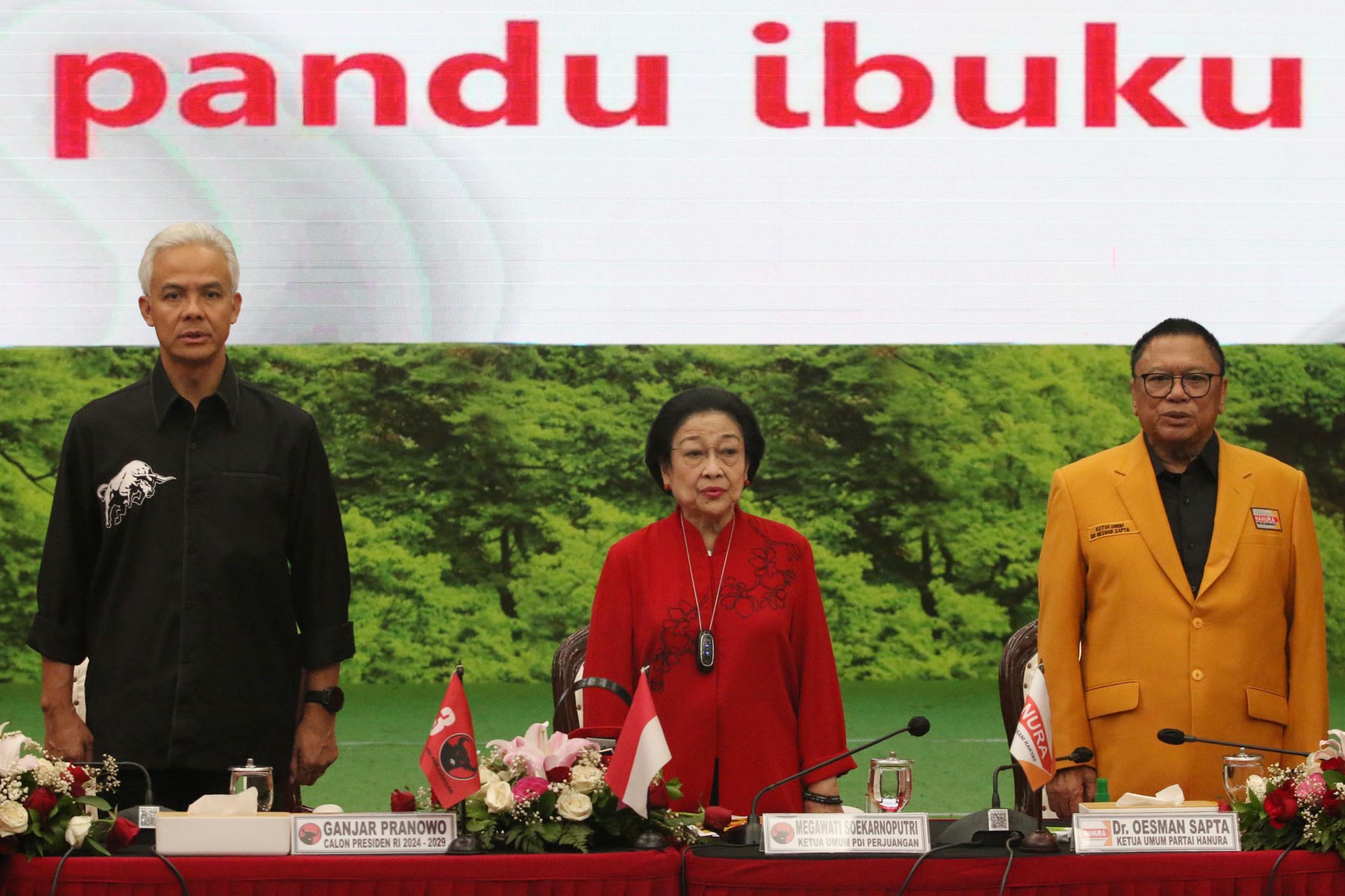 Ketua Umum PDIP Megawati Soekarnoputri (tengah), Ketua Umum Hanura Oesman Sapta Odang (kanan) dan bakal calon Presiden Ganjar Pranowo (kiri) menyanyikan lagu Indonesia Raya di kantor DPP PDIP, Menteng, Jakarta, Senin (28/8/2023). (katafoto/str)