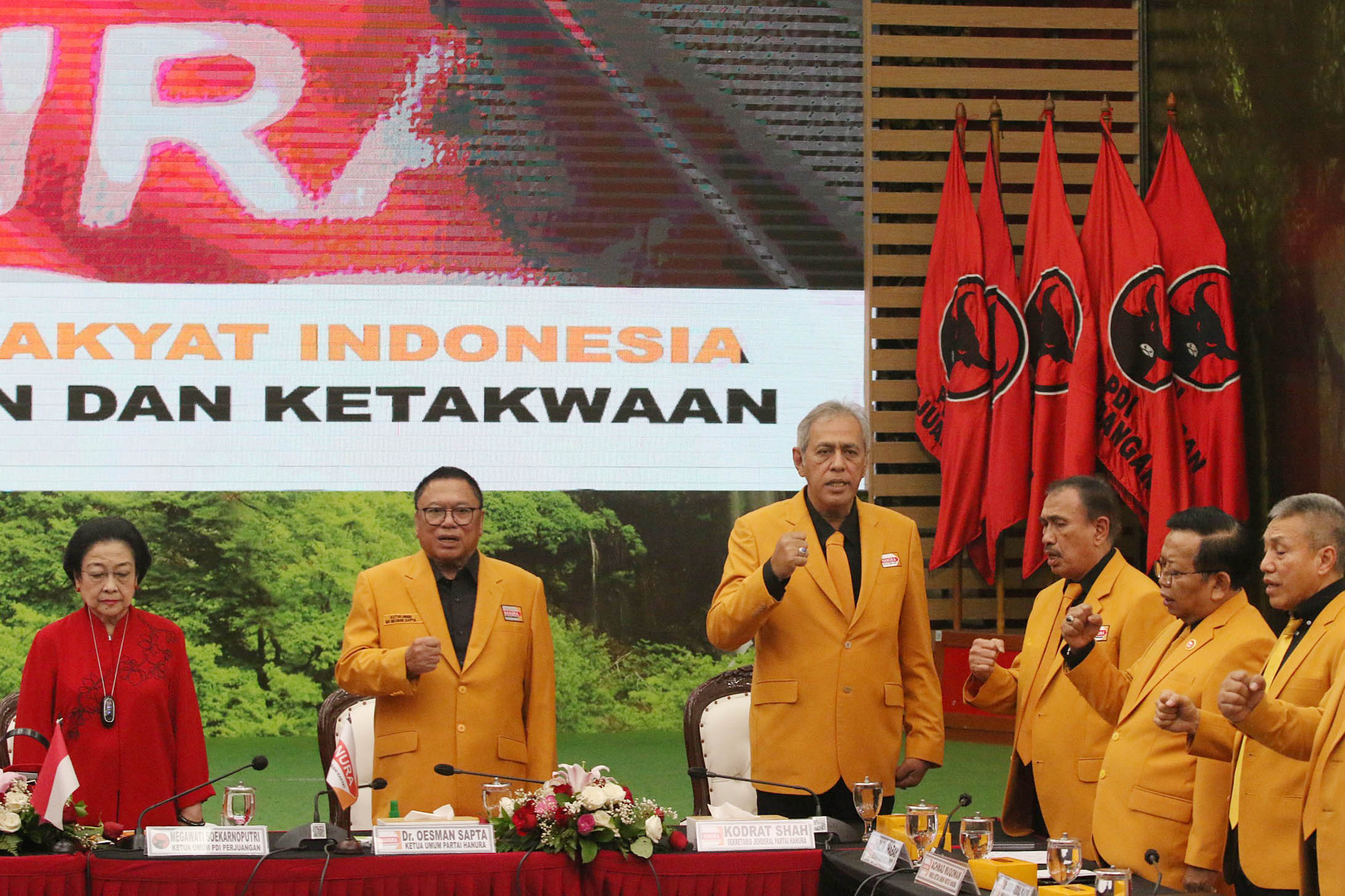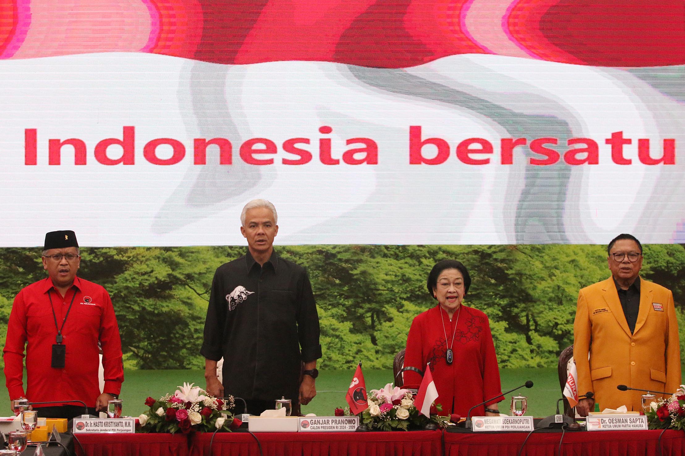 (Ki-Ka) Sekretaris Jenderal PDI Perjuangan (PDIP) Hasto Kristiyanto, bakal calon Presiden Ganjar Pranowo, Ketua Umum PDIP Megawati Soekarnoputri dan Ketua Umum Hanura Oesman Sapta Odang menyanyikan lagu Indonesia Raya di kantor DPP PDIP, Menteng, Jakarta, Senin (28/8/2023). (katafoto/str)