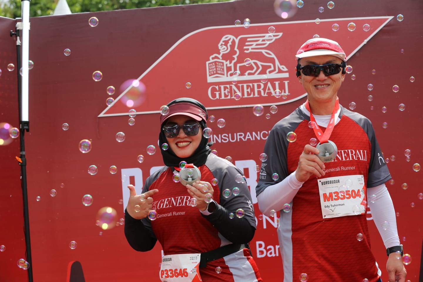 hief Executive Officer PT Asuransi Jiwa Generali Indonesia Edy Tuhirman (kanan), berfoto bersama  Chief Marketing Officer  Vivin Arbianti  saat turut hadir meramaikan Borobudur Marathon 2023 di Magelang, Jawa Tengah, Minggu (19/11/2023). Sebagai official insurance partner Borobudur Marathon yang keenam kalinya , Generali Indonesia telah memberikan perlindungan kepada 10.000 pelari Borobudur Marathon 2023 atas risiko meninggal dunia dan perawatan rumah sakit yang diakibatkan kecelakaan termasuk berbagai risiko yang berhubungan langsung dengan olahraga lari selama acara berlangsung. Total pelari Borobudur Marathon yang dilindungi oleh Generali Indonesia sejak tahun 2018 hingga saat ini adalah sebanyak 34.000 pelari. (Katafoto.co/HO)