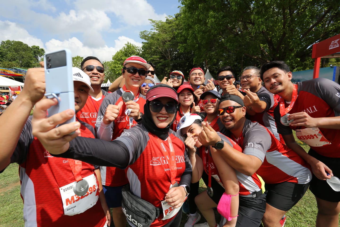 Chief Marketing Officer  PT Asuransi Jiwa Generali Indonesia  Vivin Arbianti  berswafoto dengan Chief Executive Officer PT Asuransi Jiwa Generali Indonesia Edy Tuhirman dan Generali Runners  saat turut hadir meramaikan Borobudur Marathon 2023 di Magelang, Jawa Tengah, Minggu (19/11/2023). Sebagai official insurance partner Borobudur Marathon yang keenam kalinya , Generali Indonesia telah memberikan perlindungan kepada 10.000 pelari Borobudur Marathon 2023 atas risiko meninggal dunia dan perawatan rumah sakit yang diakibatkan kecelakaan termasuk berbagai risiko yang berhubungan langsung dengan olahraga lari selama acara berlangsung. Total pelari Borobudur Marathon yang dilindungi oleh Generali Indonesia sejak tahun 2018 hingga saat ini adalah sebanyak 34.000 pelari. (Katafoto.co/HO)