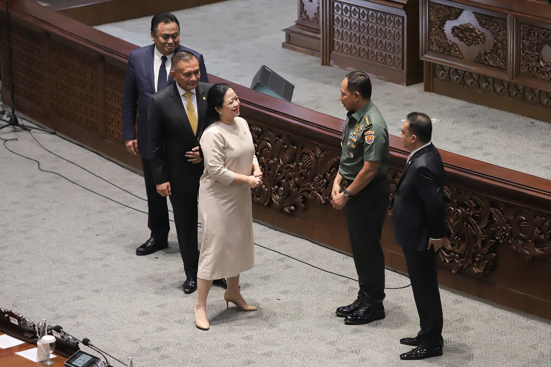 Ketua DPR RI, Puan Maharani (tengah) didampingi Wakil Ketua DPR, Rachmat Gobel (kiri) dan Sufmi Dasco Ahmad (kanan) dan Lodewijk Freidrich Paulus (kedua kiri) berbincang dengan Panglima TNI Jenderal Agus Subiyanto saat Rapat Paripurna Penetapan Panglima TNI di Gedung Nusantara I, Kompleks Parlemen, Senayan, Jakarta, Selasa (21/11/2023). (katafoto/str)