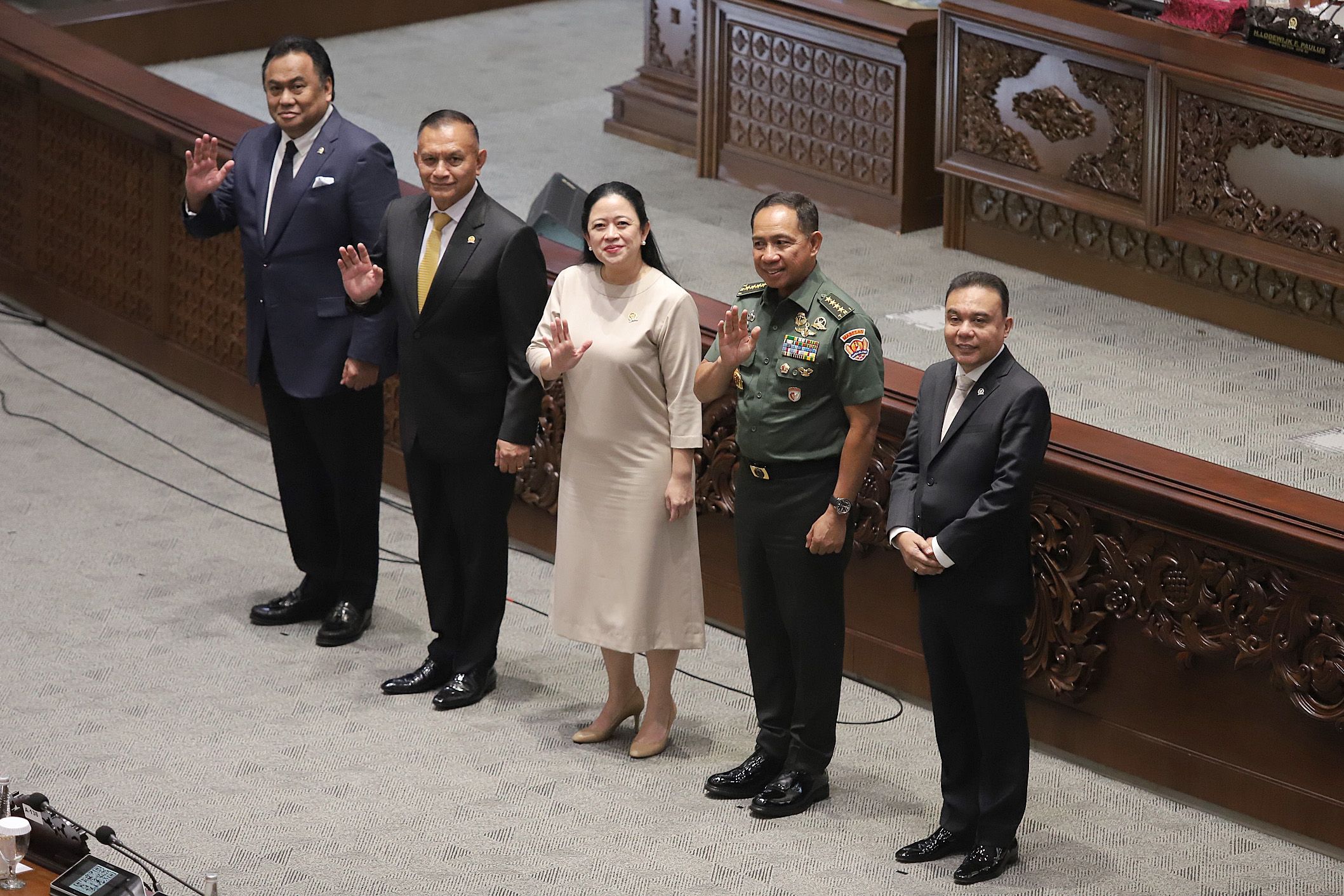 Ketua DPR RI, Puan Maharani (tengah) didampingi Wakil Ketua DPR, Rachmat Gobel (kiri) dan Sufmi Dasco Ahmad (kanan) dan Lodewijk Freidrich Paulus (kedua kiri) foto bersama dengan Panglima TNI Jenderal Agus Subiyanto (kedua kanan) saat Rapat Paripurna Penetapan Panglima TNI di Gedung Nusantara I, Kompleks Parlemen, Senayan, Jakarta, Selasa (21/11/2023). (katafoto/str)