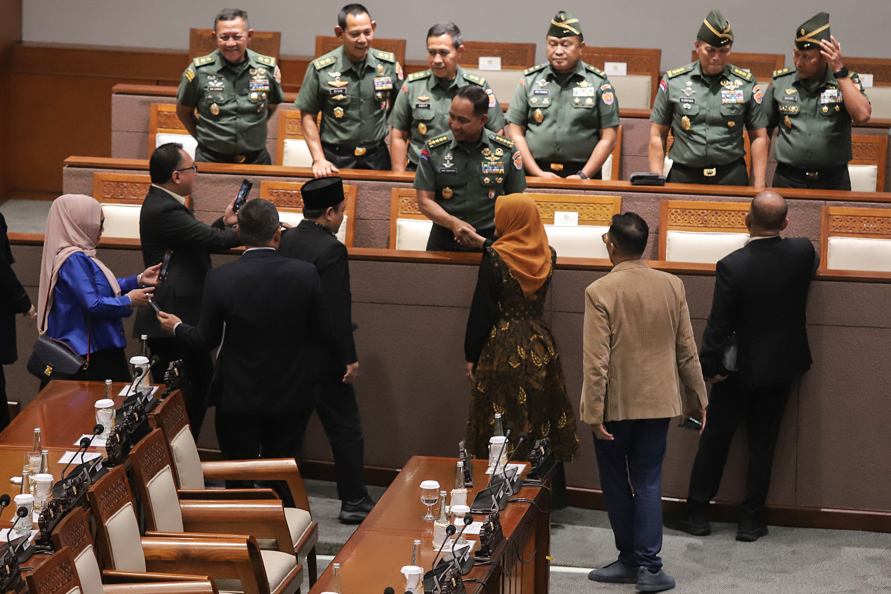 Panglima TNI Jenderal Agus Subiyanto mendapat ucapan selamat dari anggota DPR RI usai Rapat Paripurna Penetapan Panglima TNI di Gedung Nusantara I, Kompleks Parlemen, Senayan, Jakarta, Selasa (21/11/2023). (katafoto/str)