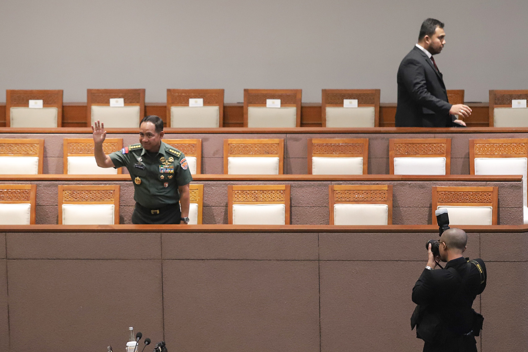 Panglima TNI Jenderal Agus Subiyanto melambaikan tangan kepada media usai Rapat Paripurna Penetapan Panglima TNI di Gedung Nusantara I, Kompleks Parlemen, Senayan, Jakarta, Selasa (21/11/2023). (katafoto/str)
