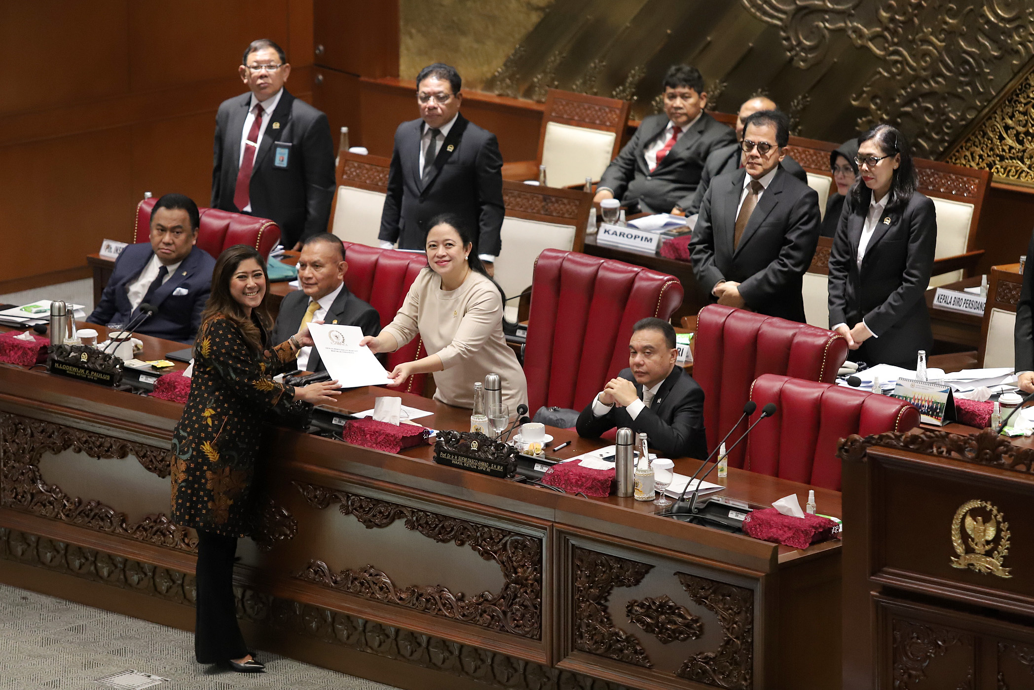 Ketua Komisi I DPR Meutya Hafid memberikan laporan hasil fit and proper test calon Panglima TNI tersebut kepada Ketua DPR RI Puan Maharani saat Rapat Paripurna Penetapan Panglima TNI di Gedung Nusantara I, Kompleks Parlemen, Senayan, Jakarta, Selasa (21/11/2023). (katafoto/str)