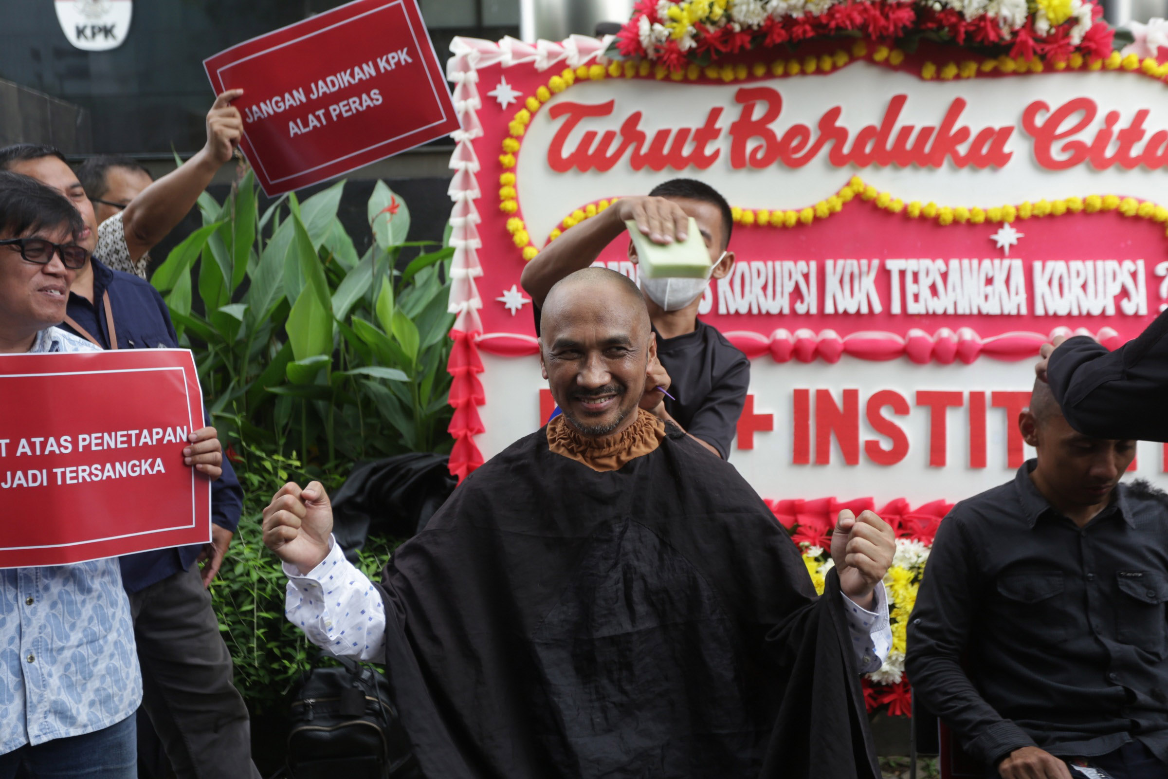 Mantan Pimpinan KPK Abraham Samad memotong rambutnya saat menggelar aksi bersama koalisi Masyarakat Sipil Anti Korupsi sebagai ungkapan rasa syukur di Gedung Merah Putih KPK, Jakarta, Kamis (23/11/2023). (katafoto/str)