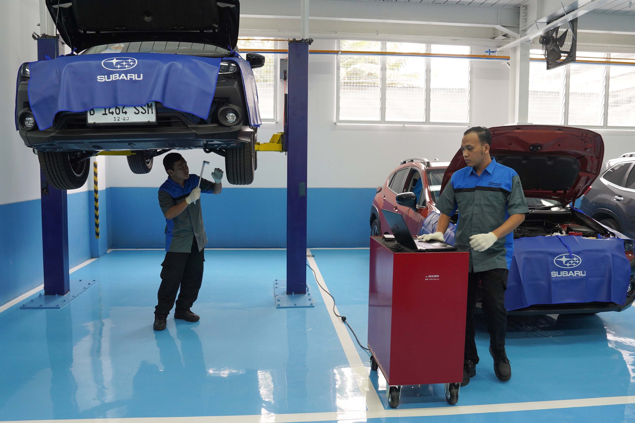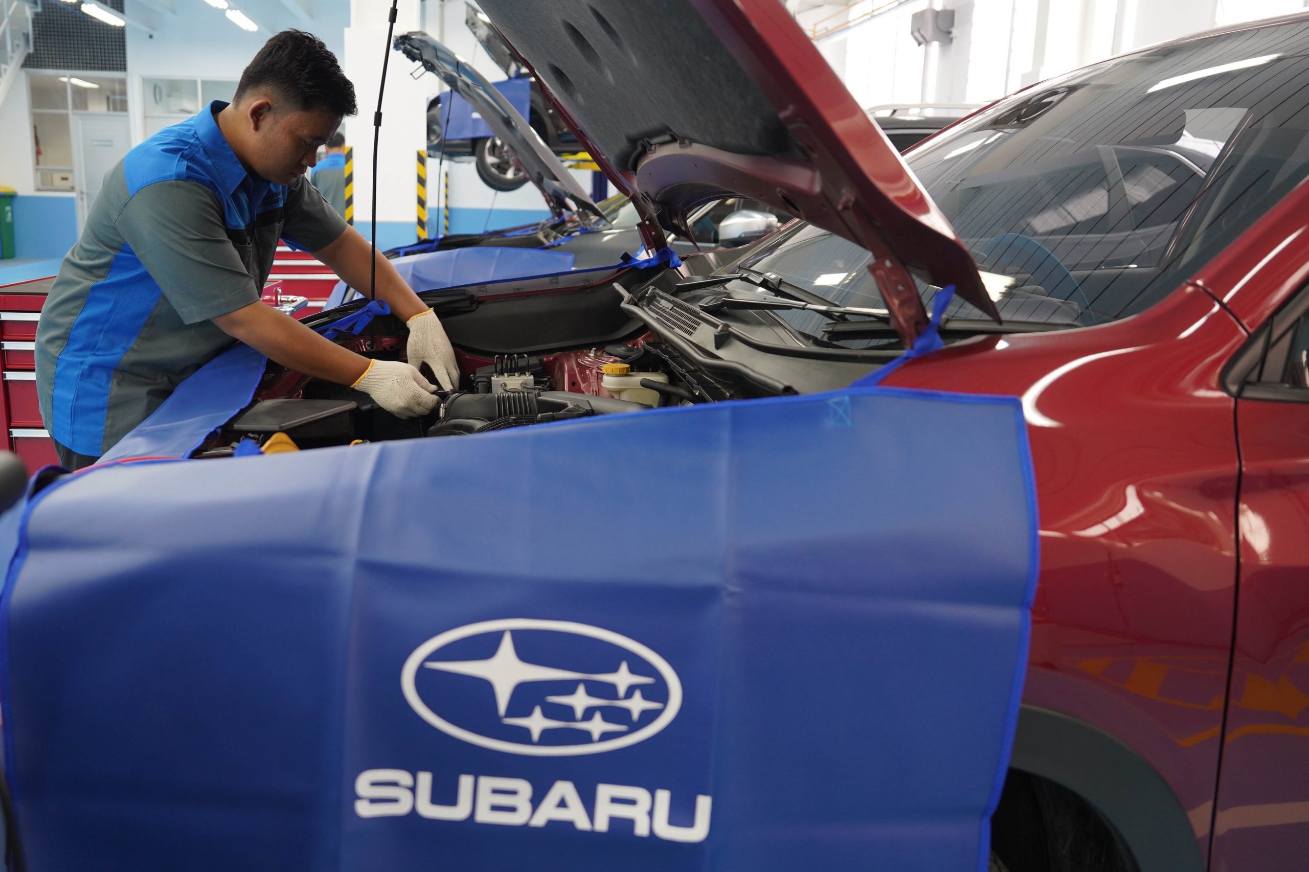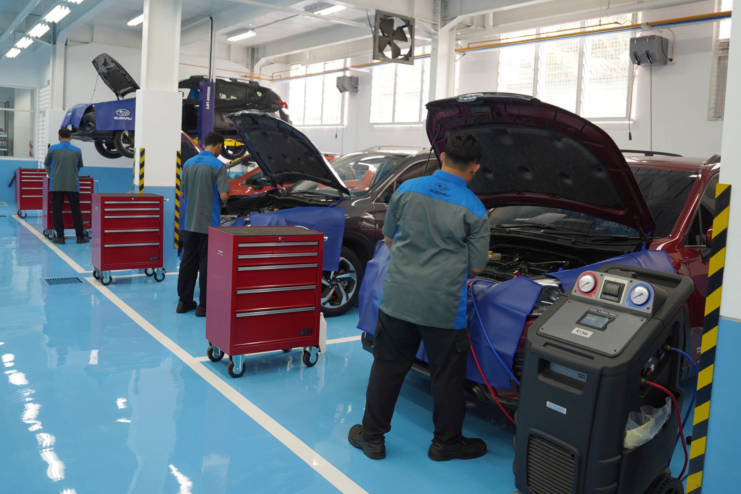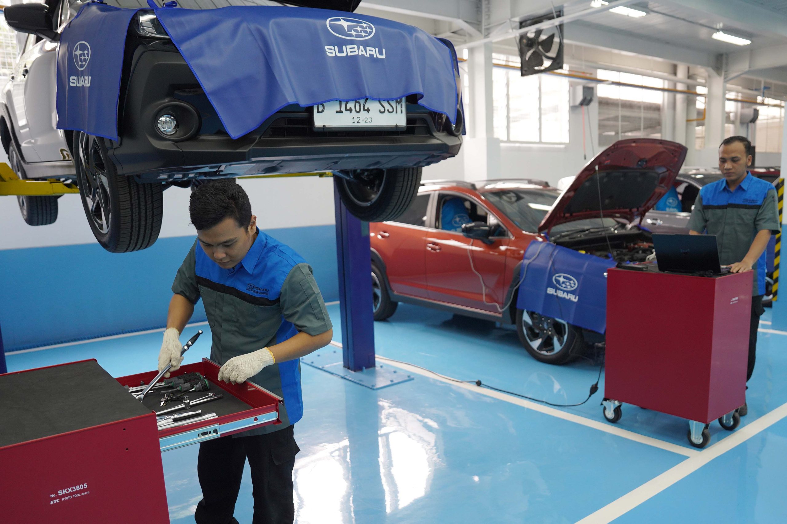 Mekanik melakukan perawatan rutin di sela pembukaan Plaza Subaru Tebet, Diler 3S (sales, service, & spare part) Subaru kedua di Tebet, Jakarta Selatan, Kamis (23/11/2023) (katafoto/Fery Pradolo)