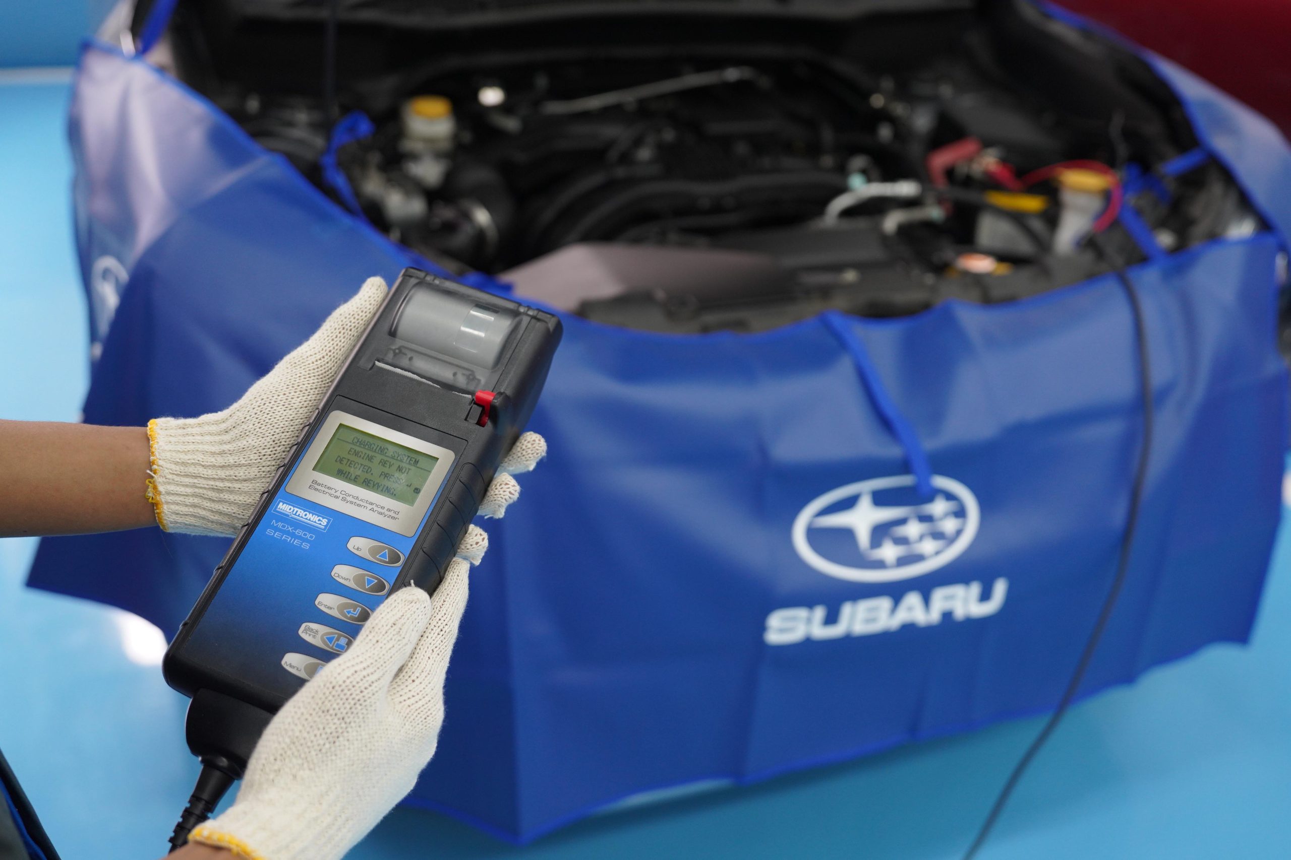 Mekanik mengukur tekanan pada mesin mobil Subaru di sela pembukaan Plaza Subaru Tebet, Diler 3S (sales, service, & spare part) Subaru kedua di Tebet, Jakarta Selatan, Kamis (23/11/2023) (katafoto/Fery Pradolo)