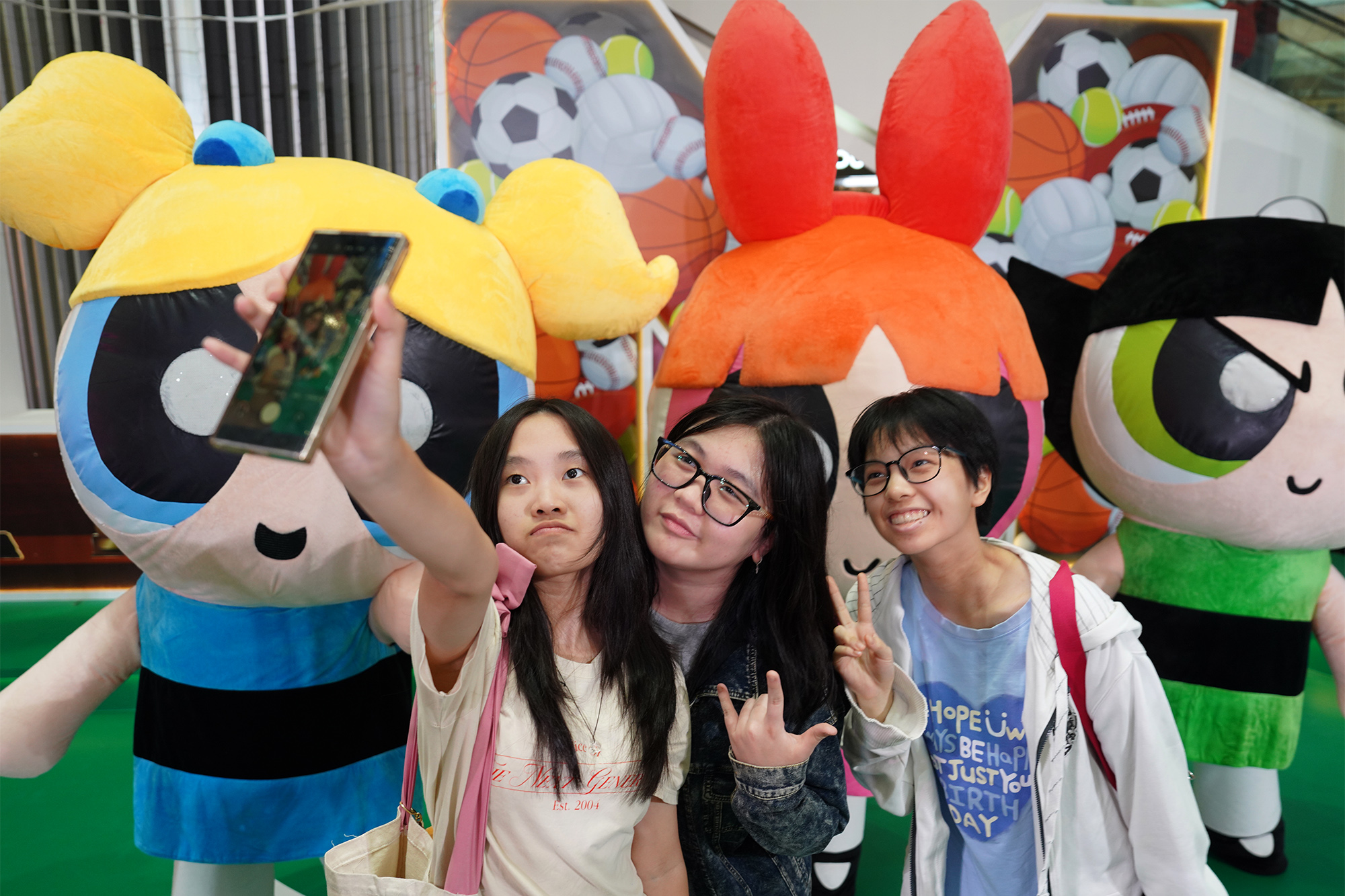 Pengunjung berswafoto dengan karakter The Powerpuff Girls pada acara Meet & Greet tiga karakter Cartoon Network yaitu Looney Tunes, The Powerpuff Girls dan We Bare Bears di atrium 2 Lippo Mall Puri, Jakarta (14/06/2024) (katafoto/Fery Pradolo)