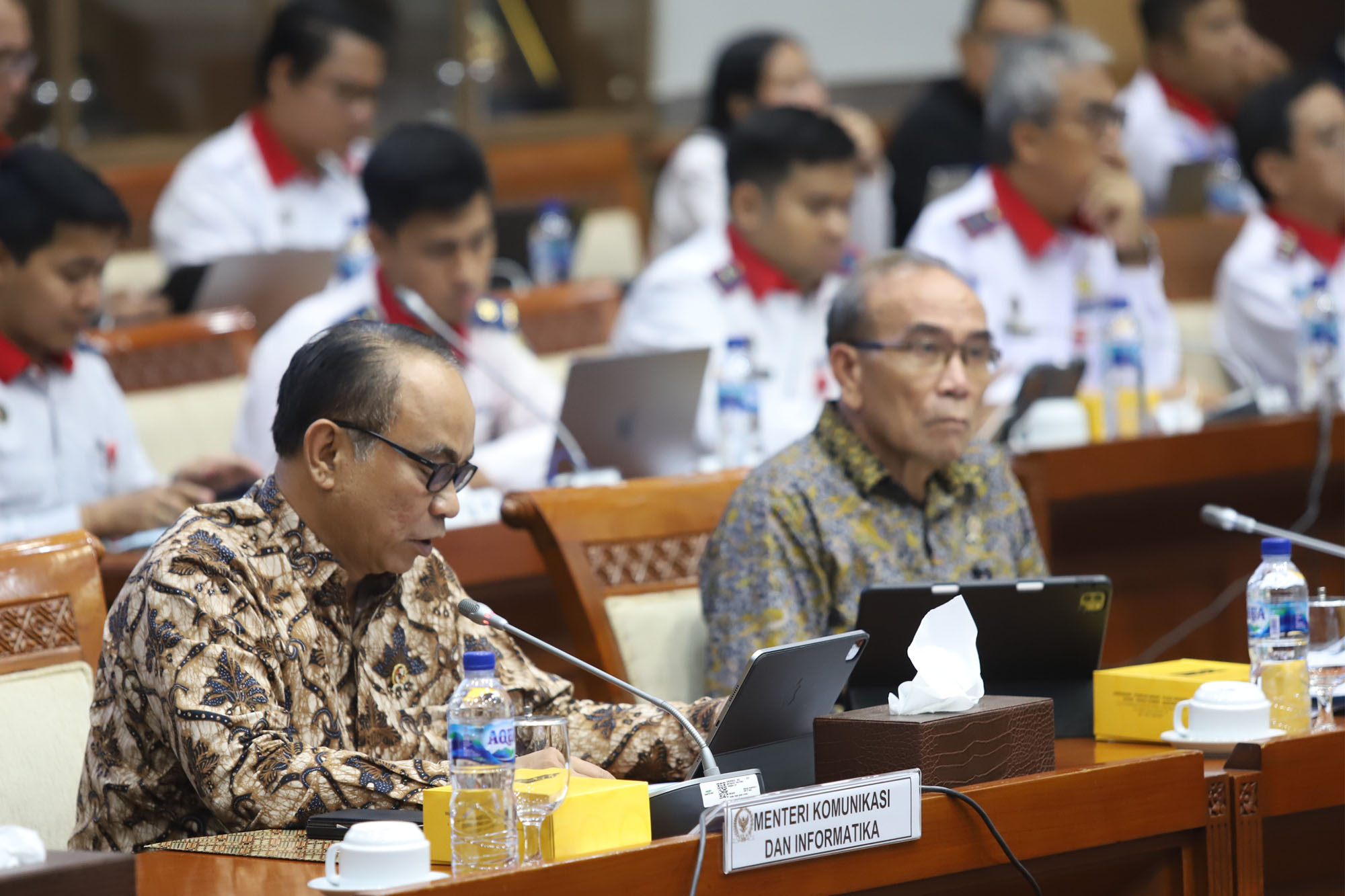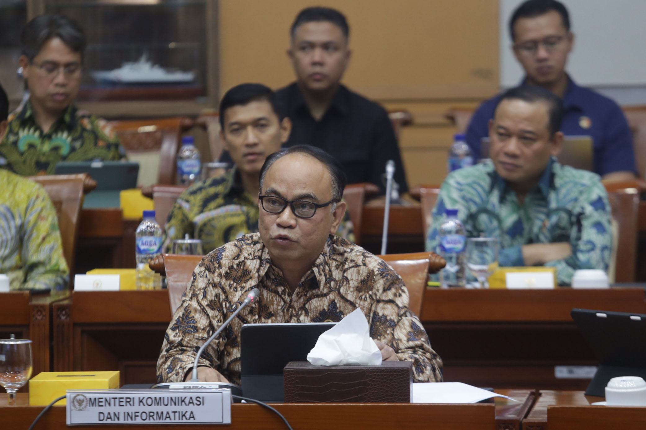 Menteri Komunikasi dan Informatika (Menkominfo) Budi Arie Setiadi saat mengikuti rapat kerja dengan Komisi I DPR membahas insiden peretasan Pusat Data Nasional (PDN) di Kompleks Parlemen, Senayan, Jakarta, Kamis (27/6/2024). (katafoto/str)