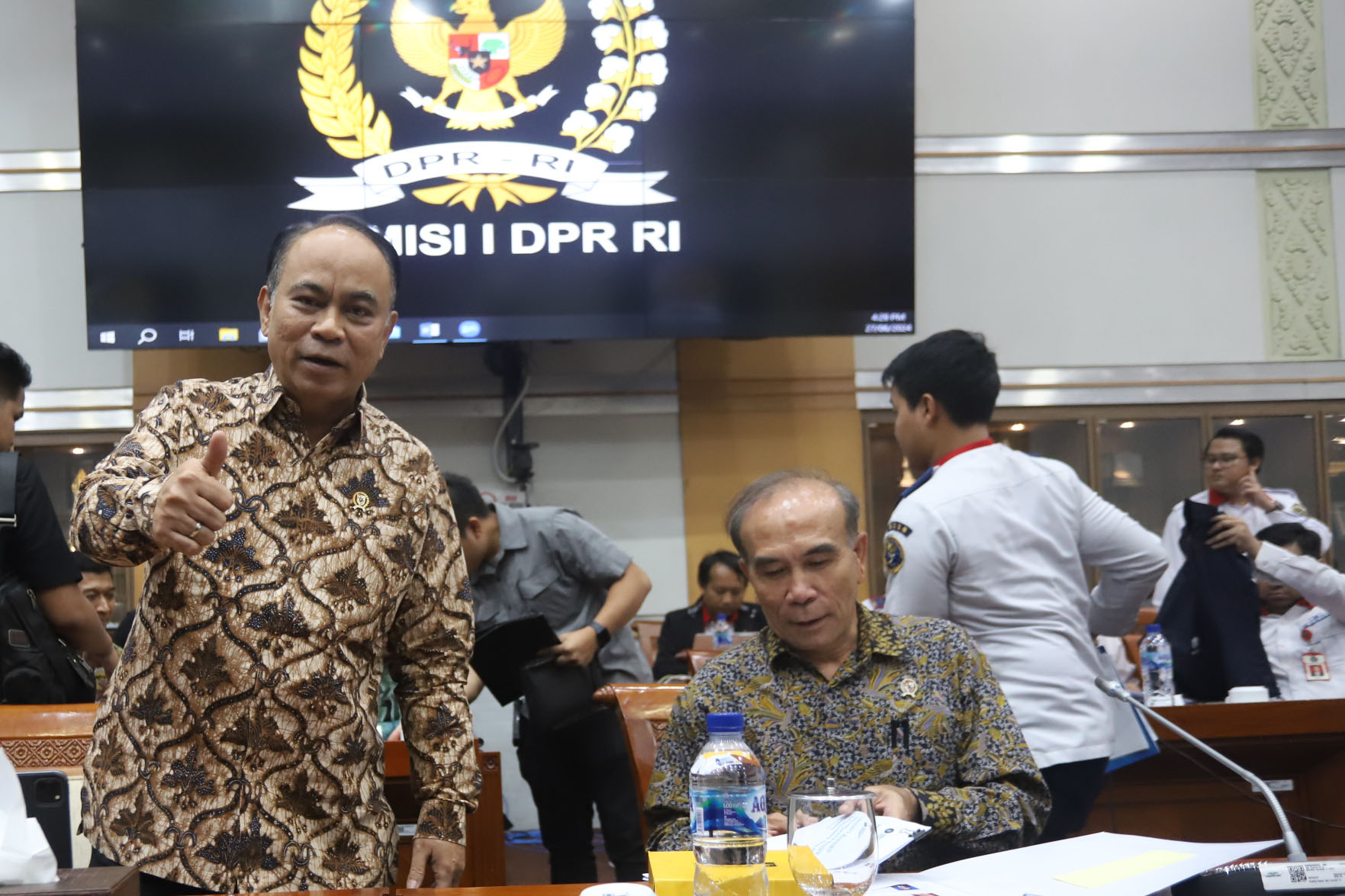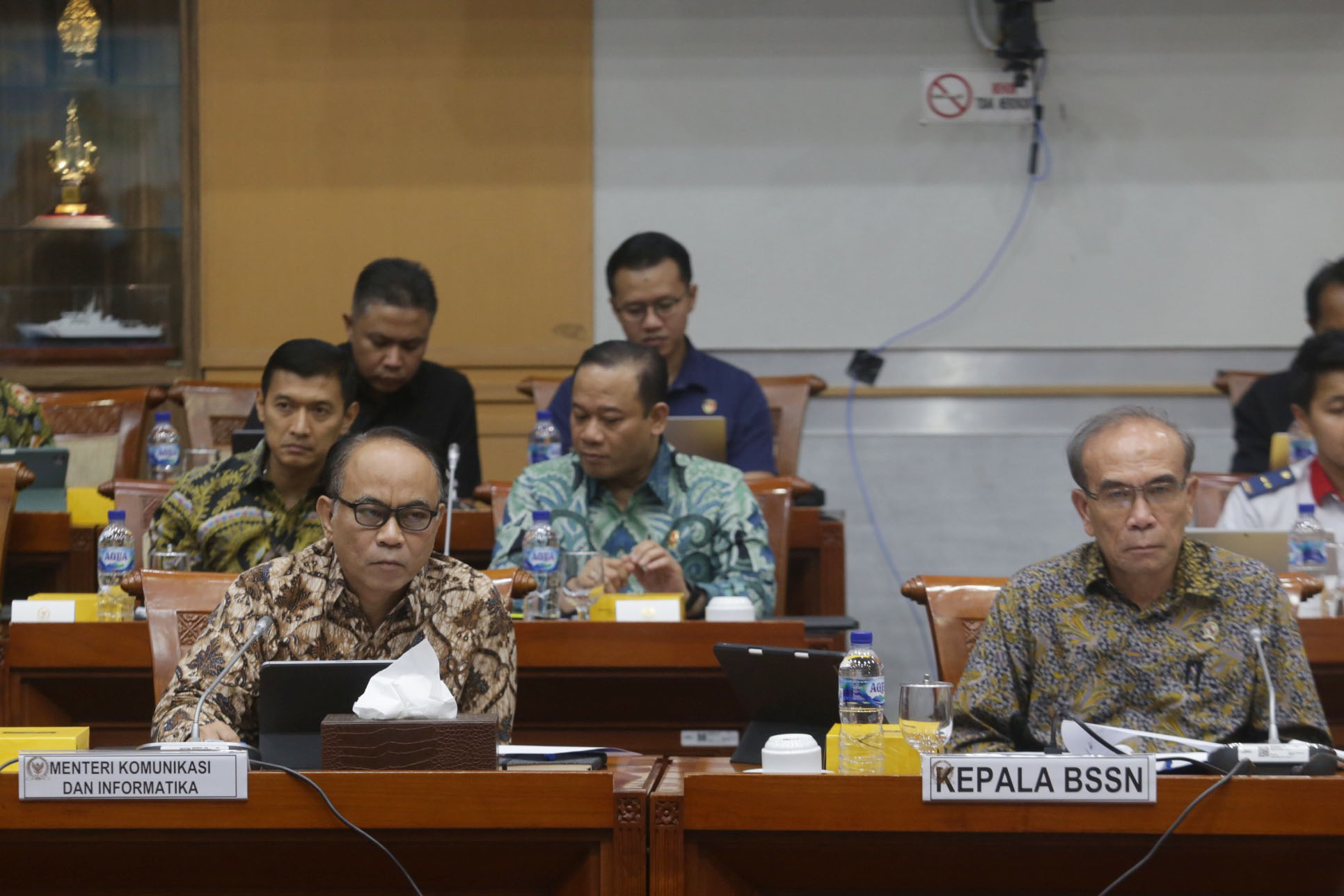 Menteri Komunikasi dan Informatika (Menkominfo) Budi Arie Setiadi dan Kepala BSSN Hinsa Siburian saat mengikuti rapat kerja dengan Komisi I DPR membahas insiden peretasan Pusat Data Nasional (PDN) di Kompleks Parlemen, Senayan, Jakarta, Kamis (27/6/2024). (katafoto/str)