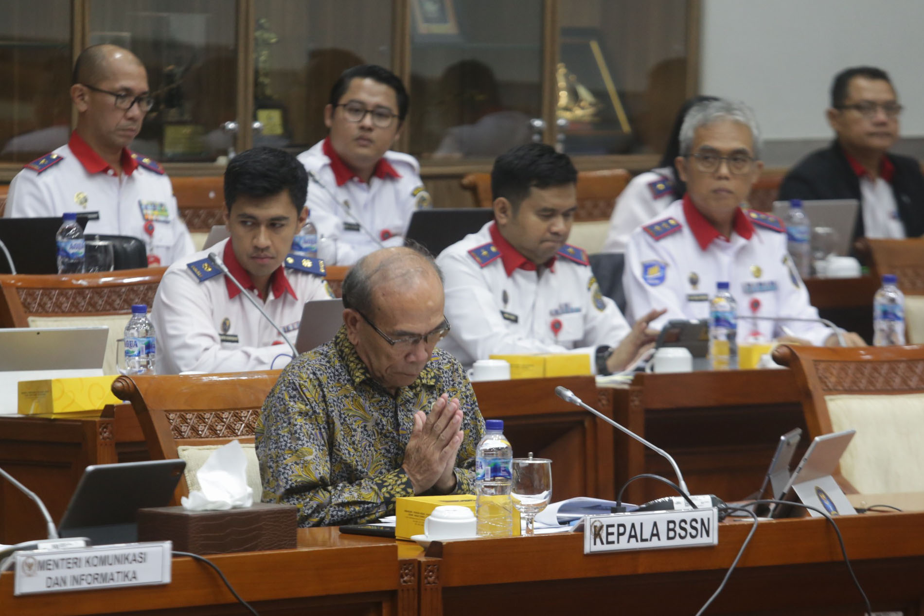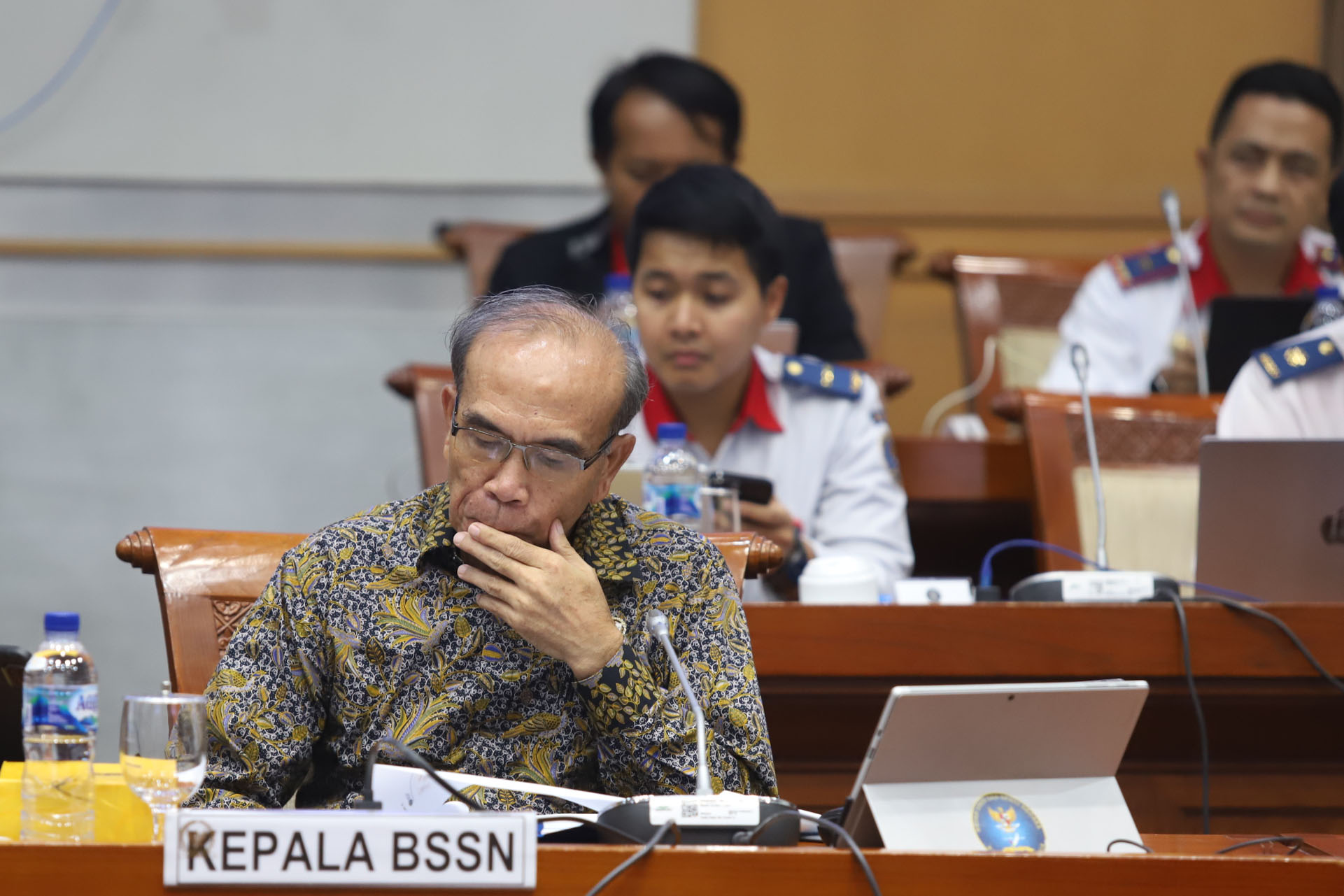 Kepala BSSN Hinsa Siburian saat mengikuti rapat kerja dengan Komisi I DPR membahas insiden peretasan Pusat Data Nasional (PDN) di Kompleks Parlemen, Senayan, Jakarta, Kamis (27/6/2024). (katafoto/str)